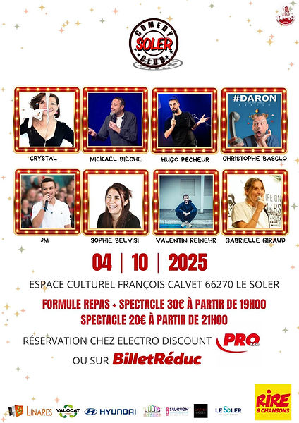 Rendez-vous le 04 Octobre 2025 pour le prochain Soler Comedy Club. Soirée enregistrée par "Rire et Chansons"